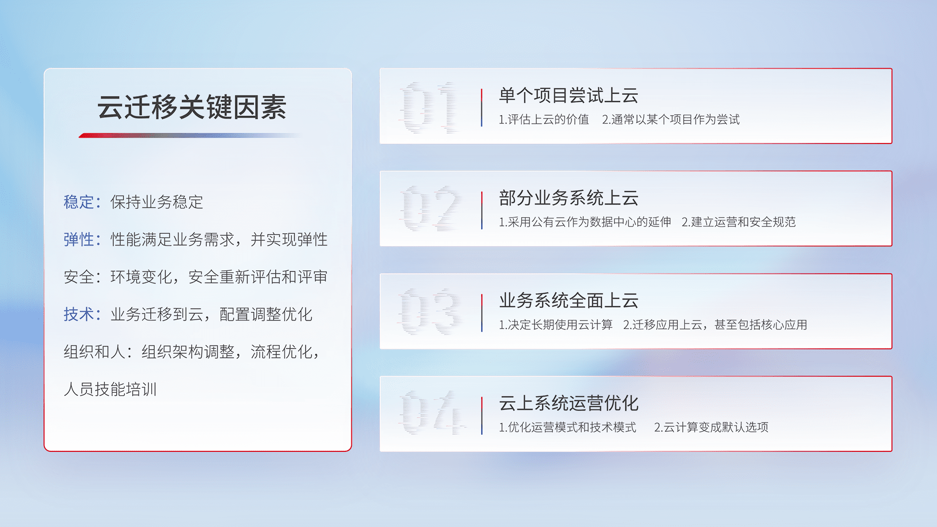 结合实际业务,,,从规划设计、、、云平台选型、、、云原生改造、、数据迁移、、集成交付,,,迁移全过程为客户识别最佳上云路径,,,,做好风险识别管理,,设计网络架构、、、身份权限、、安全审计合规、、操作审计、、、日志审计、、监控告警策略、、多站点容灾设计等,,对云上基础设施进行整体规划,,,提升IT治理水平,,以满足弹性、、、高可用、、、高性能的需求。。。