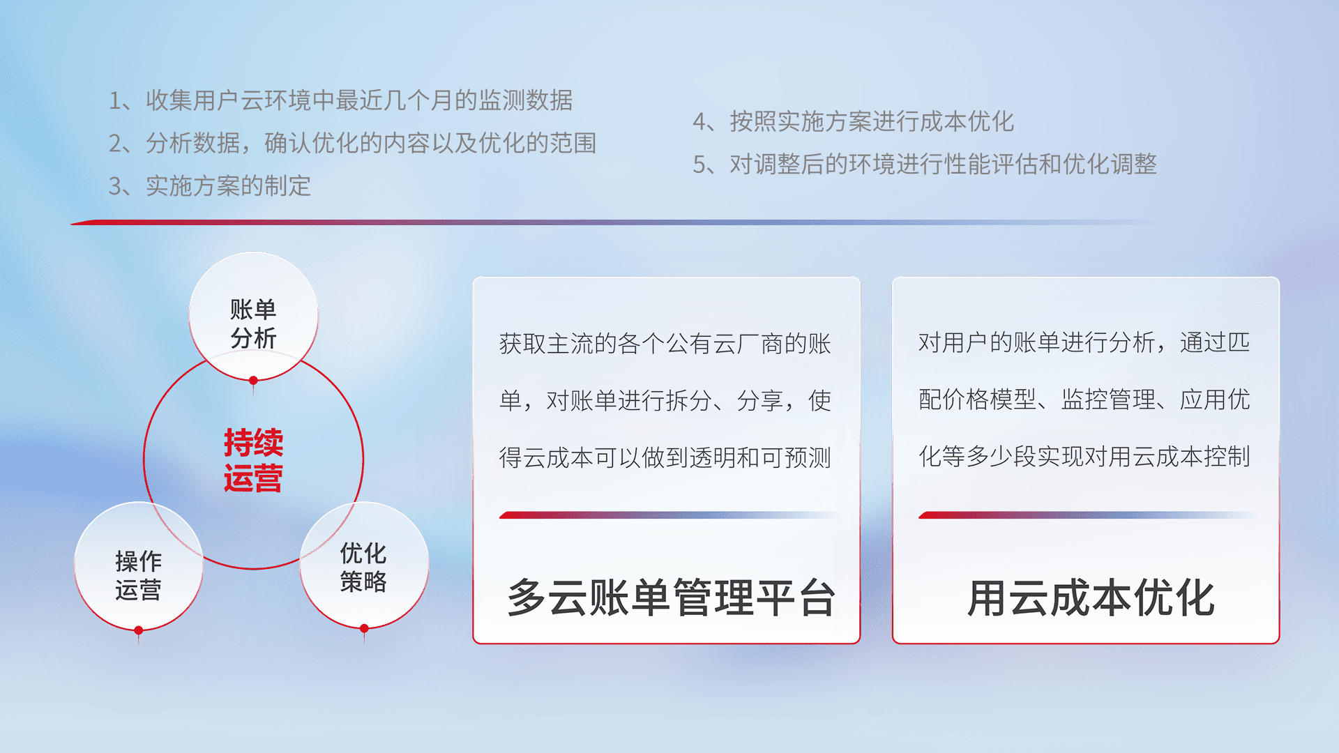 通过多云纳管,,以统一的资源数据模型把客户的云资源进行抽象和封装,,,进而实现对多云资源的统一操作,,,,保障云资源管理的可靠性、、、稳定性与可用性。。量身定制化运维内容,,,配置、、、、开发运维、、、、补丁管理、、、、备份、、、监控、、认证和访问管理、、、审计和日常巡检等,,保障在用云过程中的可靠度,,,,稳定度以及高可用率。。。。